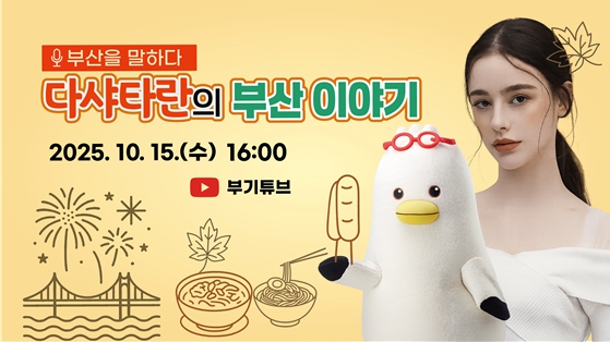 [뉴스노크=김인호 기자] 부산시는 오늘(15일) 오후 4시 시 소통캐릭터 '부기'의 유튜브채널(부기튜브)을 통해 '홍보대사 다샤 타란의 부산을 말하다' 라이브 방송을 개최한다고 밝혔다.