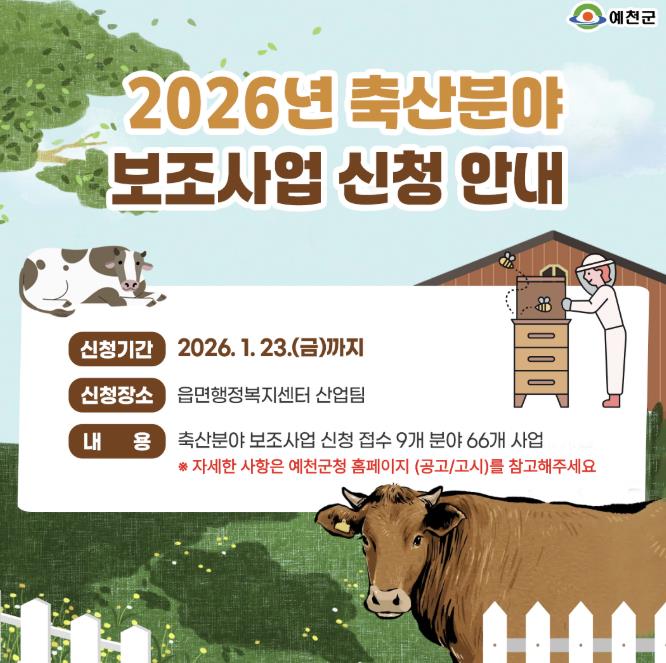 [뉴스노크=김인호 기자] 예천군은 2026년도 축산 7개 분야 66여 개의 보조사업에 대해 23일까지 읍‧면 행정복지센터에서 신청을 받는다고 밝혔다.