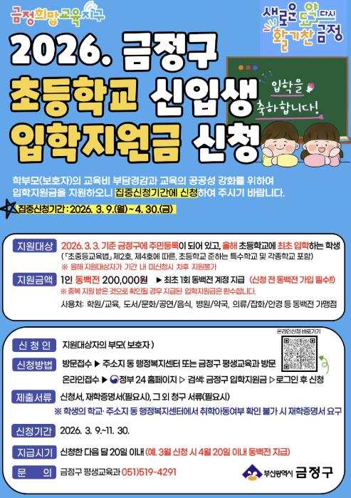 2026년 금정구 초등학교 입학지원금 신청은 3월 9일부터 신청할 수 있으며, 지원 대상은 올해 3월 3일 기준으로 금정구에 주민등록이 되어 있고, 초등학교에 최초 입학하는 학생으로 소득 수준에 관계없이 지원한다.