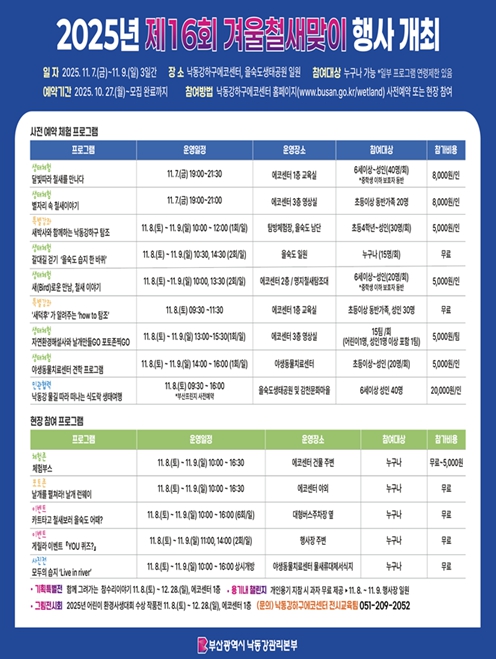 사전 예약은 오는 10월 27일부터 낙동강하구에코센터 누리집에서 선착순으로 가능하며, 전화 문의는 시 낙동강하구에코센터로 하면 된다.