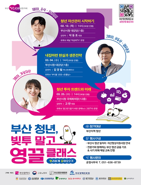 [뉴스노크=김인호 기자] 부산시는 급변하는 금융 환경 속에서 지역 청년들이 올바른 자산관리를 통해 경제적 자립 기반을 다질 수 있도록 오는 2월 12일부터 총 3회에 걸쳐 '부산청년, 빚투 말고 영끌(영리하게 끌어모으기) 클래스'를 개최한다고 밝혔다.