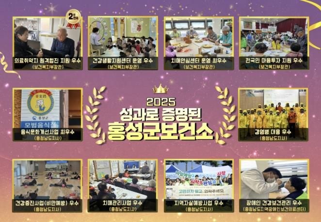 홍성군보건소는 2025년 중앙부처와 충청남도가 주관한 11개 분야 평가에서 우수기관에 선정되며 사업 기획력과 실행력을 동시에 인정받았다. 주요 수상내역으로는 ▲의료취약지 원격협진 지원사업 2년 연속 우수기관(보건복지부) ▲건강생활지원센터 운영 우수기관(보건복지부) ▲치매안심센터 운영 최우수기관(보건복지부) ▲치매관리사업 우수사례 공모전 맞춤형 사례관리 부문 우수상(보건복지부) ▲전국민 마음투자 지원사업 우수기관(보건복지부) ▲음식문화개선사업 평가 최우수기관(충청남도) ▲감염병 대응 우수기관(충청남도) ▲건강증진사업(비만예방) 우수기관(충청남도) ▲치매관리사업 우수기관(충청남도) ▲지역자살예방사업 우수기관(충청남도) ▲장애인 건강보건관리 우수기관(충청남도지역장애인보건의료센터)이 포함됐다.