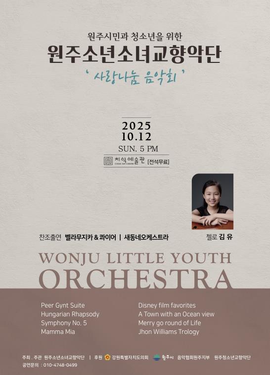 [뉴스노크=김인호 기자] 원주소년소녀교향악단은 오는 12일 오후 5시, 치악예술관에서 ‘사랑나눔음악회’를 통해 지역사회와 함께하는 따뜻한 무대를 마련한다.