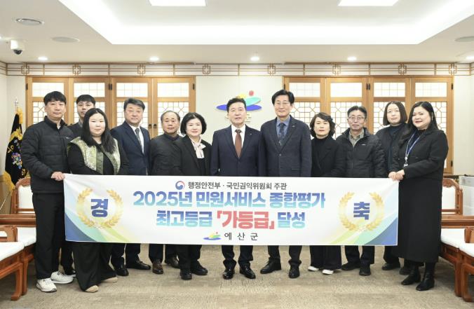 [뉴스노크=김인호 기자] 예산군이 행정안전부와 국민권익위원회가 공동 주관한 2025년 민원서비스 종합평가에서 전국 최우수 등급인 ‘가’ 등급을 획득해 9년 연속 민원서비스 우수기관으로 선정되는 쾌거를 거뒀다.