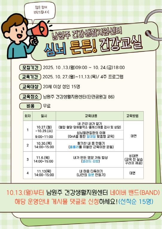 [뉴스노크=김인호 기자] 남원주건강생활지원센터는 심뇌혈관질환의 이해·예방과 건강관리를 돕기 위해 10월 27일부터 11월 13일까지 ‘심뇌 튼튼! 건강교실’을 운영한다.