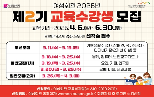 [뉴스노크=김인호 기자] 부산시 여성회관은 오는 3월 11일부터 '2026년 제2기 교육과정' 수강생을 모집한다고 밝혔다.