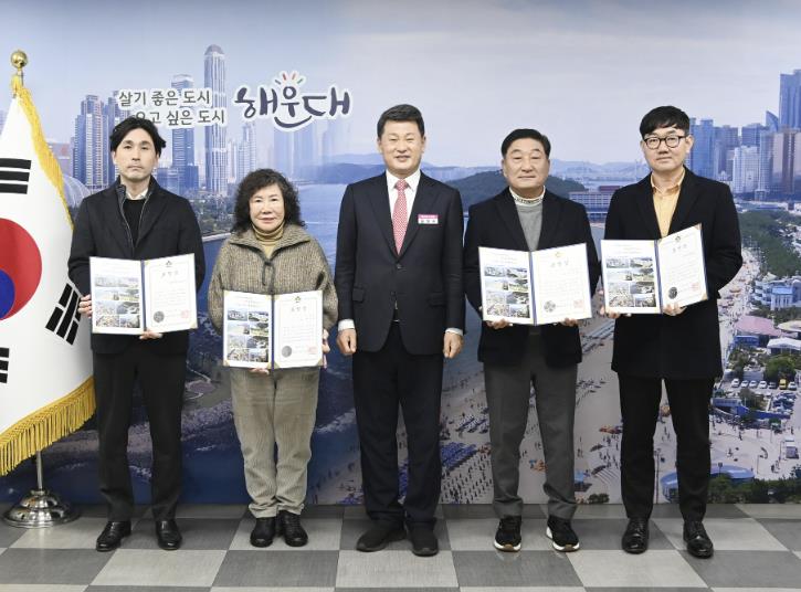 | ▲ 해운대구는 우수납세자를 표창했다. 사진 왼쪽부터 이승건 일광여객자동차 대표, 안경희 씨, 김성수 구청장, 박규환 씨, 차승훈 금양통신 부 |