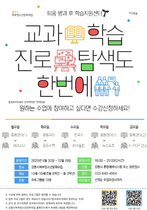 [뉴스노크=김인호 기자] 강릉시 북부청소년문화의집은 청소년이 직접 원하는 수업을 선택해 참여할 수 있는 '청소년방과후아카데미 학습지원센터' 프로그램 참가자를 추가 모집한다.