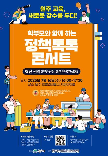 원강수 원주시장은 “학부모가 직접 제안하고 공감하는 정책이야말로 지속가능한 교육의 시작”이라며, “경제교육도시 원주의 방향을 함께 그려갈 이번 토크콘서트에 많은 관심과 참여를 바란다.”라고 말했다.