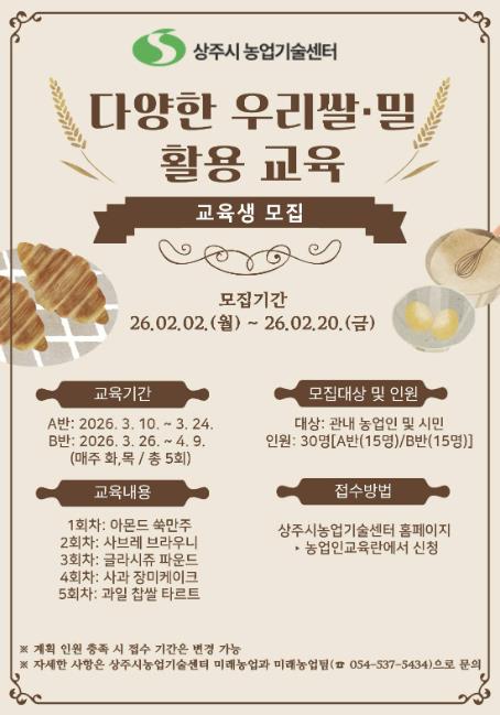 | ▲ 상주시상주시, 2026년 『다양한 우리쌀·밀 활용 교육』 교육생 모집농업기술센터 |