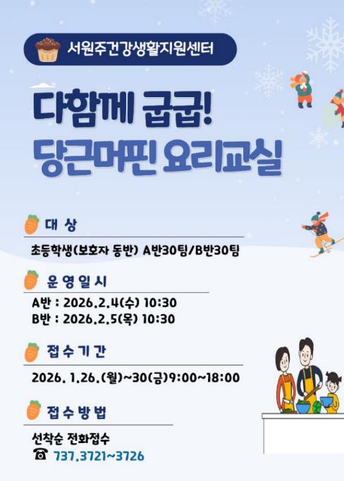[뉴스노크=김인호 기자] 서원주건강생활지원센터는 겨울방학 중 아이들의 올바른 식습관 형성을 돕기 위해 ‘다함께 굽굽! 당근머핀 요리교실’ 프로그램을 운영한다.
