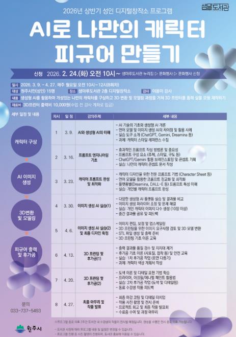 3월 7일부터 4월 27일까지 ▲생성형 인공지능(AI)을 활용해 캐릭터를 구상하고 3D프린터를 통해 제작해 보는 ‘AI로 나만의 캐릭터 피규어 만들기’ ▲3D모델링의 기본 개념을 배우고 3D입체물을 실제로 출력해 보는 ‘출력까지 해보는 3D모델링 기초 클래스’ 등 2가지 과정이 진행된다.