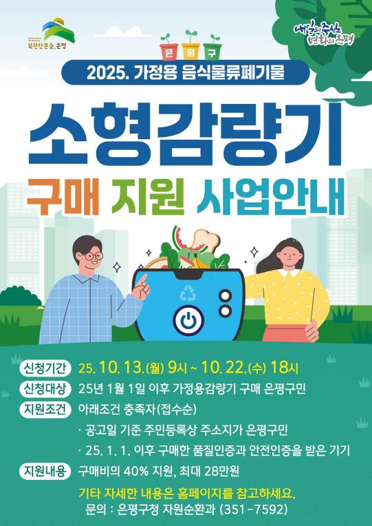 신청 자격은 공고일 기준 신청인의 주민등록상 주소지가 은평구이며, 2025년 1월 1일 이후 품질인증과 안전 인증을 받은 소형감량기를 구매한 경우 해당된다. 단, 음식물쓰레기를 분쇄 후 하수관 통해 배출하는 ‘주방용 오물분쇄기’는 지원 제외 대상이다.