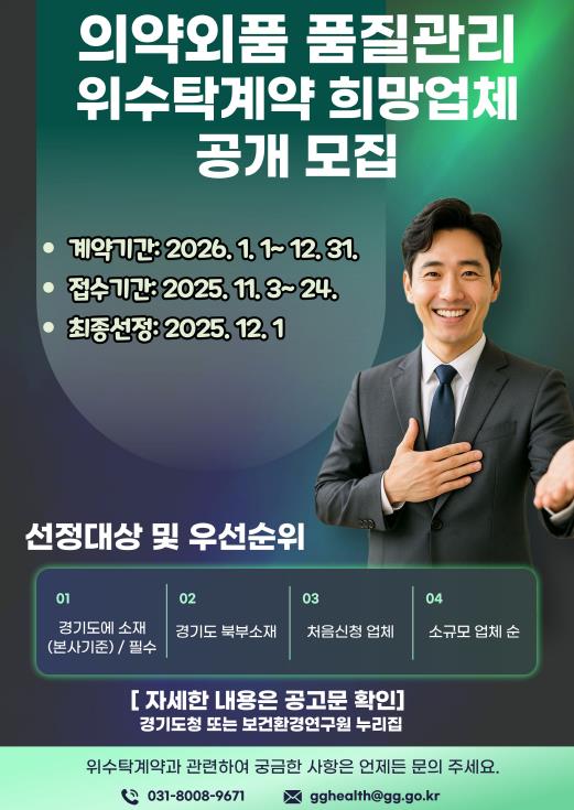 [뉴스노크=김인호 기자] 경기도보건환경연구원은 오는 24일까지 ‘2026년 의약외품 품질검사 위·수탁계약’ 참여를 희망하는 제조·수입업체를 모집한다.