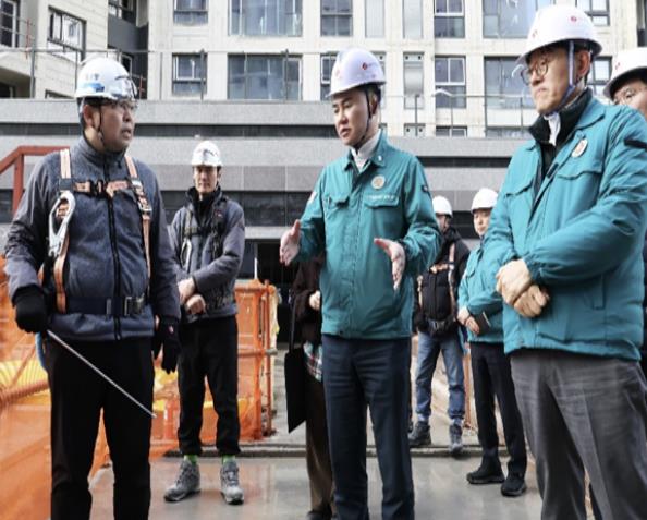 | ▲ 오언석 도봉구청장(가운데)이 지역 대형공사장을 찾아 현장 관계자에게 근로자 안전관리 준수 등을 강조하고 있다. |