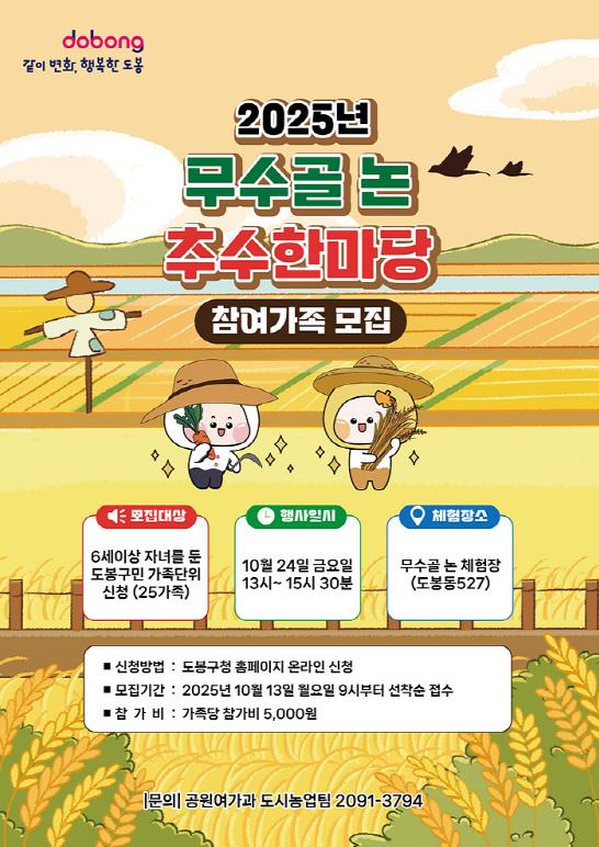 [뉴스노크=김인호 기자] 서울 도봉구가 오는 10월 24일 무수골 친환경 논 체험장(도봉동 527)에서 ‘무수골 논 추수한마당’ 행사를 개최한다.