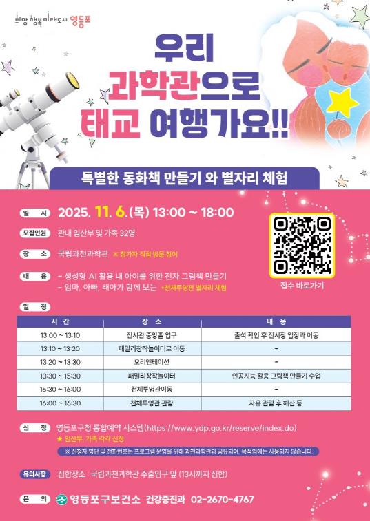[뉴스노크=김인호 기자] 영등포구가 예비 부모와 태아가 함께 교감하는 특별 체험 프로그램 ‘과천과학관 태교 여행’ 참여자를 모집한다고 밝혔다.