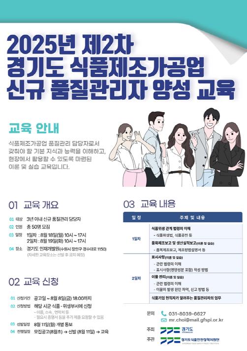 [뉴스노크=김인호 기자] 경기도는 오는 8월 18일부터 19일까지 이틀간 경기도인재개발원에서 `2025년 제2차 경기도 식품제조가공업 신규 품질관리자 양성 교육`을 추가로 실시한다.