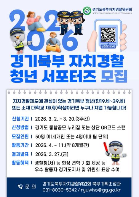 [뉴스노크=김인호 기자] 경기도북부자치경찰위원회는 자치경찰제에 대한 청년층의 관심을 높이고 현장 중심 치안 활동을 함께할 ‘2026 경기북부 자치경찰 청년 서포터즈’를 3월 2일부터 20일까지 공개 모집한다.