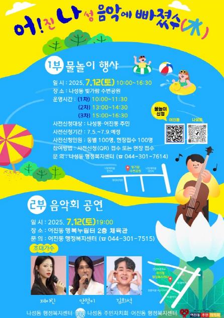 [뉴스노크=김인호 기자] 세종특별자치시 어진동과 나성동이 오는 12일 나성동 빛가람수변공원에서 ‘어진! 나성 음악에 빠졌수(水)’여름 축제를 공동으로 개최한다.