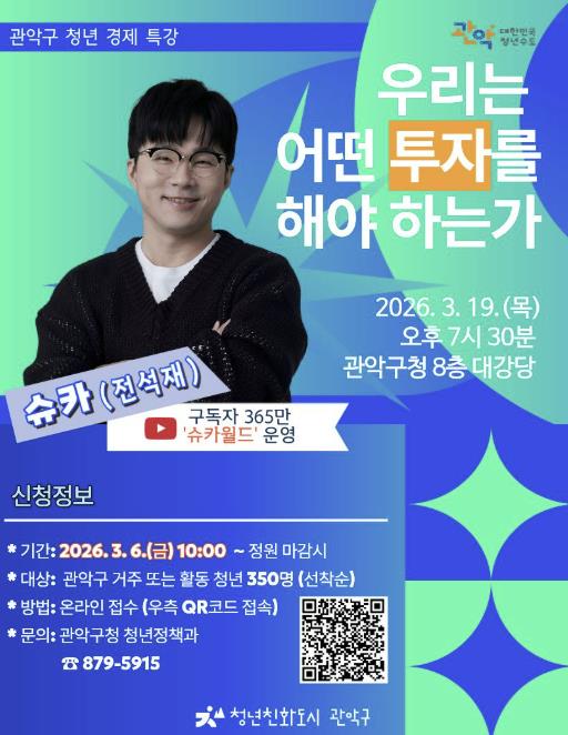 [뉴스노크=김인호 기자] 관악구가 오는 3월 19일, 청년들의 경제적 자립을 지원하고 올바른 재테크 가치관 형성을 돕기 위해 인기 경제 유튜버 ‘슈카’를 초청해 특별 강연을 개최한다.