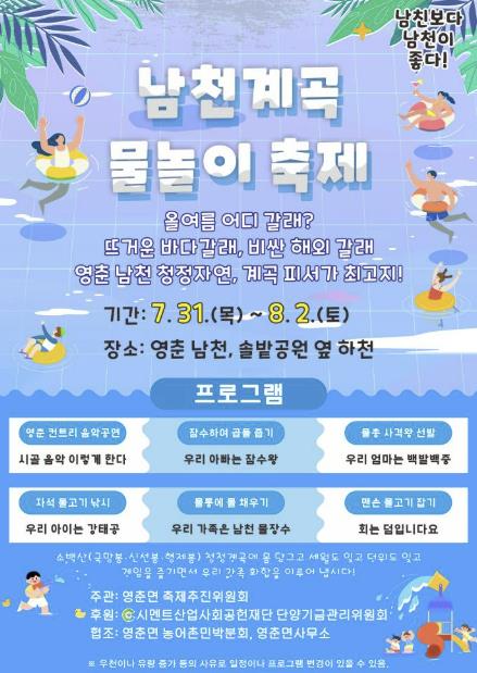 영춘면 축제추진위원회가 주관하는 이번 행사는 남천1리 솔밭공원 앞 하천 일원에서 열리며, 여름철 대표 피서지로 주목받고 있는 남천의 자연 매력을 널리 알리고 지역 공동체의 활기를 높이기 위해 마련됐다.
