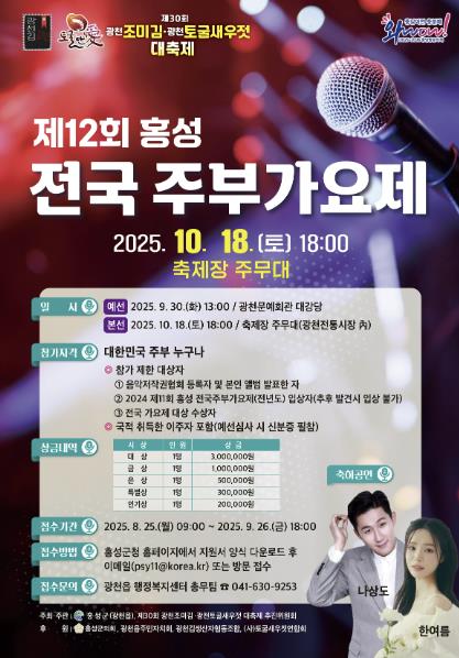 이번 주부가요제는 오는 25일부터 참가자 접수를 시작하며, 성별무관, 국적을 취득한 이주자를 포함한 대한민국 주부라면 누구나 참여할 수 있다. 참가 신청은 홍성군청 누리집에서 신청서를 내려받아 9월 26일까지 광천읍 행정복지센터 총무팀에 방문 접수하거나 이메일로 제출하면 된다.
