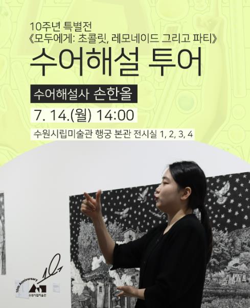 이번 수어 해설 전시 투어는 현재 수원시립미술관에서 개최 중인 개관 10주년 기념 특별전 《모두에게: 초콜릿, 레모네이드 그리고 파티》를 소개한다. 손한올 수어 해설사와 함께 전시를 감상하고 해설이 끝난 후에는 전시를 기획한 큐레이터와의 질의응답이 마련되어 전시와 현대미술에 관한 궁금증을 해소할 수 있도록 기획됐다.