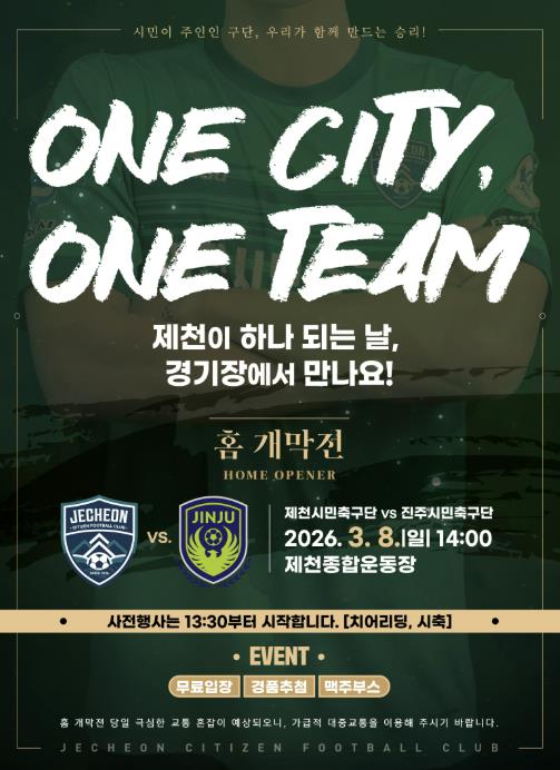 [뉴스노크=김인호 기자] 제천시민축구단이 오는 3월 8일 오후 2시, 제천종합운동장에서 역사적인 홈 개막전을 연다.