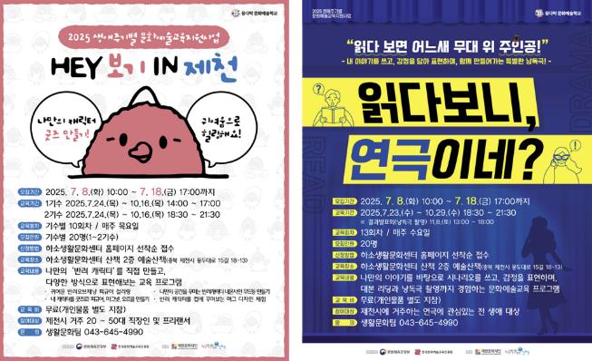 [뉴스노크=김인호 기자] 제천문화재단은 2025년 생애주기별 문화예술교육 지원사업 '꿈다락 문화예술학교' 운영기관으로 선정되어, 통합자율형 프로그램 'HEY 보기 IN 제천'과 '읽다보니, 연극이네?'를 운영한다고 밝혔다.
