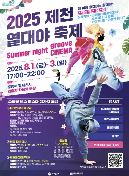 특히 스트릿 댄스 페스타에는 CERA(스우파2 마네퀸), ISAK(스우파1 YGX) 등으로 구성된 국내 최정상급 댄서들이 심사위원으로 참여한다. 또한 대상 300만원을 포함, 총 700만원 규모의 상금이 걸려 있어 수준 높은 무대와 박진감 넘치는 배틀이 펼쳐질 것으로 기대된다. 참가 접수는 오는 18일 오후 10시까지 진행되며 자세한 내용은 제천문화재단 홈페이지에서 확인할 수 있다.