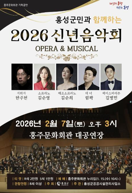 [뉴스노크=김인호 기자] 홍성군 홍주문화회관은 내달 7일 오후 3시에 ‘홍성군민과 함께하는 2026 신년음악회’를 개최한다고 밝혔다. 이번 음악회는 병오년 새해를 맞아 오페라와 뮤지컬 넘버를 아우르는 다채로운 프로그램으로 관객들과 만날 예정이다.