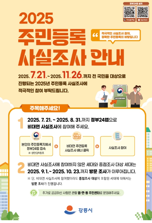 [뉴스노크=김인호 기자] 강릉시는 전 시민을 대상으로 오는 10월 23일까지 주민등록지와 실거주지 일치 여부를 조사하는 ‘2025년 주민등록 사실조사’를 실시한다.