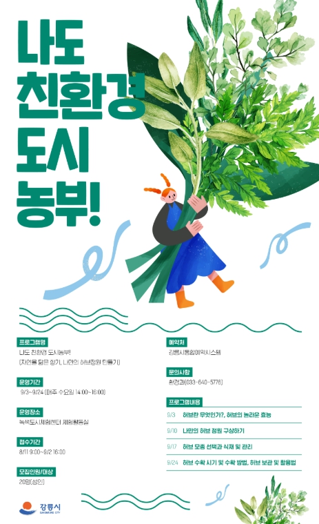 [뉴스노크=김인호 기자] 강릉시는 오는 9월 4일부터 성인을 대상으로 한 '나도 친환경 도시농부!' 환경교육 프로그램을 운영한다.