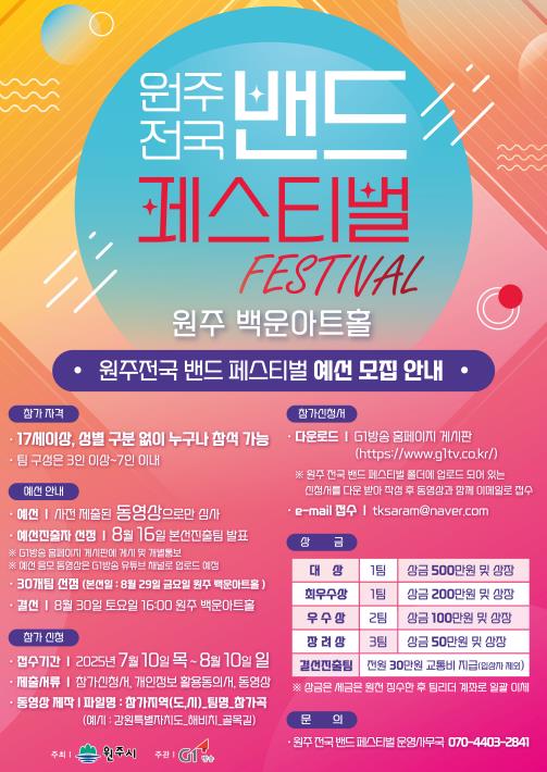 박혜순 문화예술과장은 “이번 페스티벌은 단순한 경연을 넘어 ‘음악과 축제의 도시 원주’의 가능성과 열정을 전국에 알리는 상징적인 자리가 될 것”이라고 말했다.