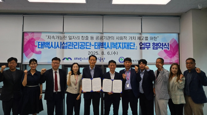 [뉴스노크=김인호 기자] 태백시시설관리공단과 태백시복지재단은 8월 6일, 공단 이사장실에서 ‘지속가능한 일자리 창출 등 공공기관의 사회적 가치 제고를 위한 업무협약’을 체결했다.