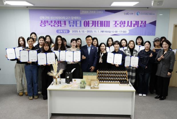 [뉴스노크=김인호 기자] 서울 성북구가 성신여자대학교와 협력해 K-뷰티 인재를 양성하고 청년들의 취·창업을 지원하기 위한 ‘성북 청년 뷰티 아카데미 조향사반’ 수료식을 11월 1일 성신여자대학교 국제교육관에서 열었다.