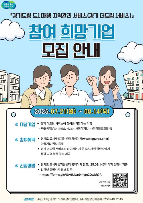도는 참여 희망기업 정보를 경기도 도시재생지원센터 누리집에 게시하고 시군 도시재생부서와 공유해 향후 계획하는 도시재생사업에 민간기업이 참여할 수 있도록 지원한다.