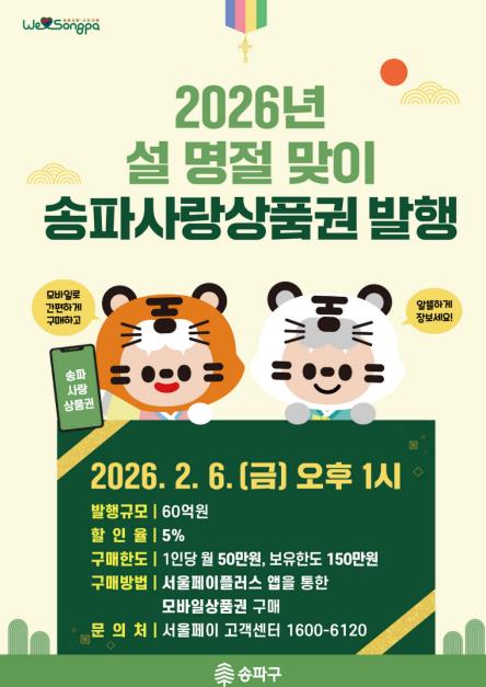 서강석 송파구청장은 “명절을 앞두고, 구민들이 장보기와외식 등 상황에 맞춰 상품권을 유연하게 활용하실 수 있도록 발행 체계를 세심하게 준비했다”며, “지역 상품권을 통해 위축된 소비심리를 되살리고, 소상공인의 매출 증대로 이어져 지역사회 경제 선순환에 도움이 되길 바란다.”고 전했다.
