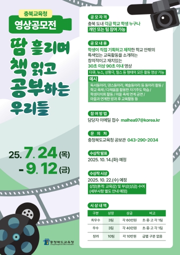 [뉴스노크=김인호 기자] 충청북도교육청은 7월 24일부터 오는 9월 12일까지 '땀 흘리며 책 읽고 공부하는 우리들'을 주제로 영상 공모전을 추진한다고 밝혔다.