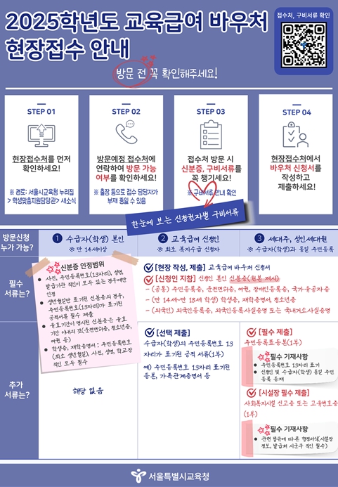 [뉴스노크=김인호 기자] 서울특별시교육청은 2025년 12월 2일부터 12월 12일까지, 2025학년도 교육급여 바우처 미신청자 중 온라인 신청이 어려운 대상을 위해 한시적 현장 접수를 운영한다고 밝혔다.