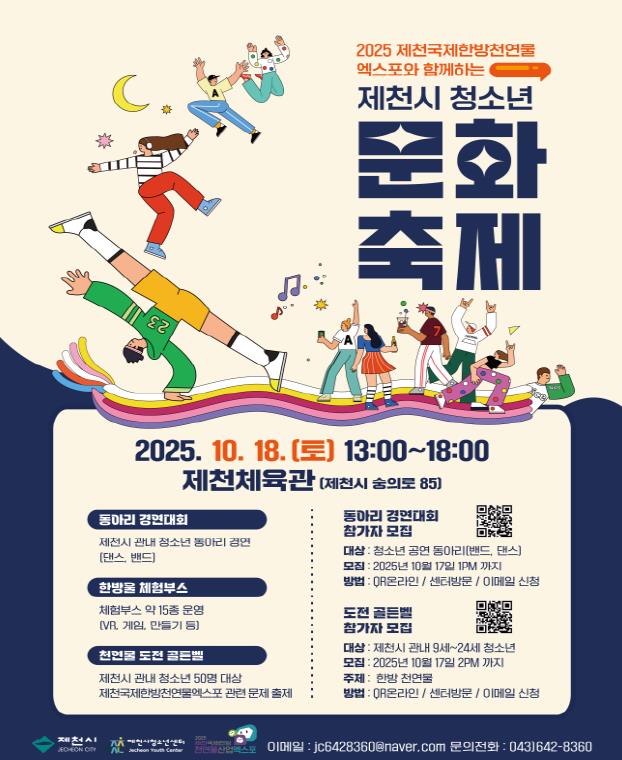 축제 현장에서는 △ 15개의 체험부스(MBTI 향수 만들기, 커피박 키링 만들기 등) △청소년동아리 공연 △“2025 제천국제한방천연물산업엑스포”와 연계된 문제로 진행하는 도전 골든벨 등 다양한 프로그램이 운영될 예정이다.