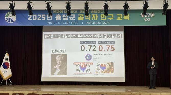 [뉴스노크=김인호 기자] 홍성군은 지난 25일 농업기술센터 대강당에서 전 직원을 대상으로 ‘2025년 홍성군 직원 인구교육’을 실시하고, 인구감소에 대응하기 위한 공직사회의 인식 제고와 정책 역량 강화를 다졌다고 밝혔다.