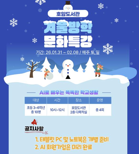 [뉴스노크=김인호 기자] 충주시 호암도서관은 겨울방학을 맞아 관내 초등학생들의 디지털 역량 강화를 위해 겨울방학 특강 ‘AI로 배우는 똑똑한 학교생활’을 운영한다고 22일 밝혔다.