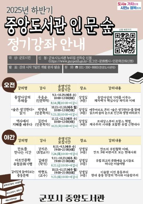 [뉴스노크=김인호 기자] 군포시 중앙도서관은 시민들의 인문학적 소양을 함양하고자 2025년 하반기 인문학 프로그램인 ‘중앙도서관 인문숲’ 강좌를 운영한다.