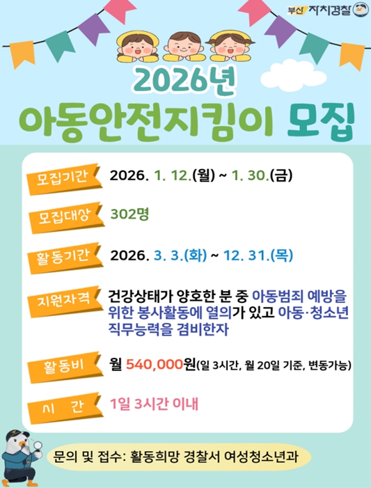 [뉴스노크=김인호 기자] 부산시 자치경찰위원회는 부산경찰청과 함께 오는 1월 12일부터 1월 30일까지 '2026년 아동안전지킴이'를 모집한다고 밝혔다.