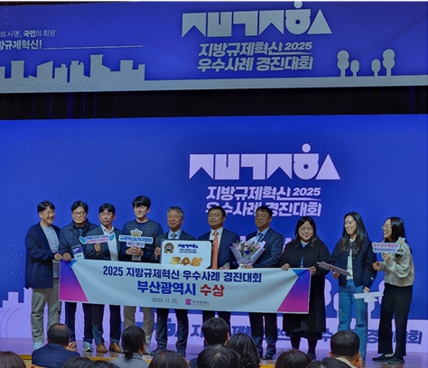 [뉴스노크=김인호 기자] 부산시는 어제(25일) 오후 세종시 정부세종컨벤션센터에서 행정안전부 주관으로 열린 '2025년 지방규제혁신 우수사례 경진대회'에서 우수상(행안부장관상)을 받았다고 밝혔다.