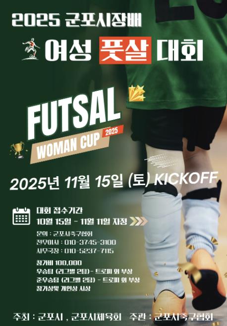 서정영 군포시체육회장은 “여성들의 건강한 스포츠 활동을 통해 활력과 에너지를 충전하고 풋살이라는 역동적인 종목을 통해 협동과 화합의 가치를 되새기는 소중한 축제의 장이 되길 바란다”고 전했다