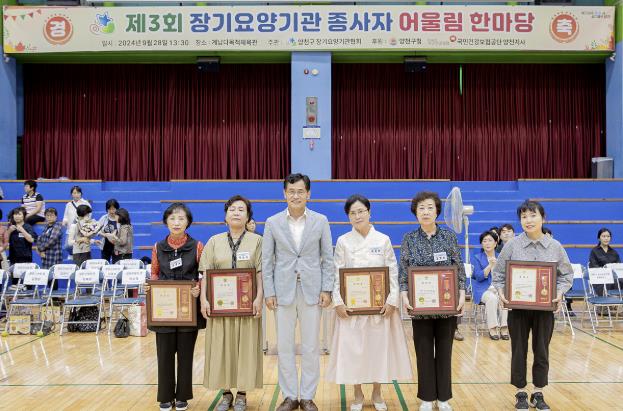 | ▲ ‘양천구 장기요양기관 종사자 어울림 행사’에서 우수종사자 표창 후 기념촬영 중인 이기재구청장 |