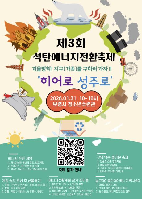 [뉴스노크=김인호 기자] 보령시가 주최하고 성주면 개화1리마을회가 주관하는 ‘제3회 겨울방학 석탄 에너지전환 축제’가 오는 1월 31일 오전 10시부터 오후 4시까지 보령시청소년수련원 일원에서 개최된다.